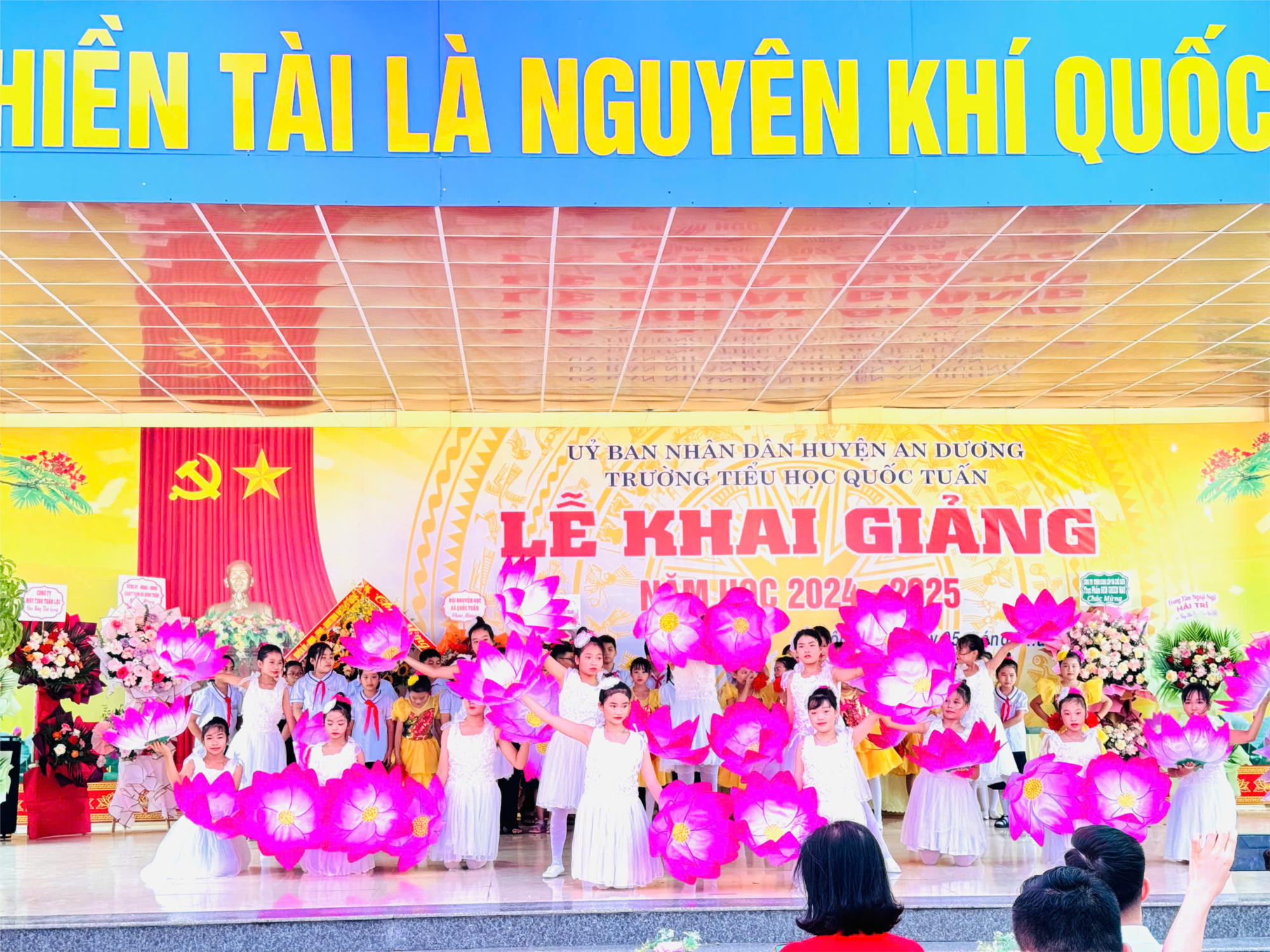 ⭐ ⭐Phát biểu tại buổi lễ khai giảng năm học mới, cô giáo Đinh Thị Huyền- Bí thư Chi bộ, Hiệu trưởng nhà trường cho biết: Nối tiếp truyền thống đã đạt được trong các năm học, thầy và trò trường TH Quốc Tuấn sẽ thực hiện tốt và phát huy nhiệm vụ của ngành GD trong năm học mới, quyết tâm thực hiện tốt các nhiệm vụ trọng tâm trong năm học .Thực hiện tốt công tác thi đua, khen thưởng. Tích cực tham mưu với các cấp, các ngành và huy động mọi nguồn lực xã hội, làm tốt công tác xã hội hóa giáo dục trong việc đầu tư nâng cấp cơ sở vật chất trong nhà trường.